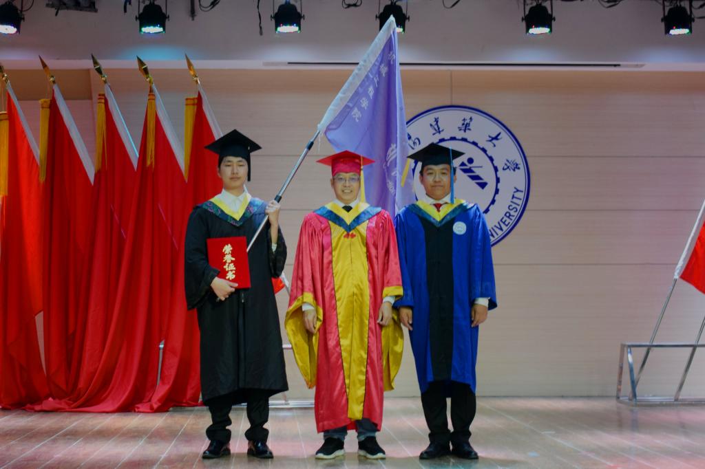 孙红、李颂华为毕业生代表颁发毕业证书、学位证书。孙红为2022届机械工程专业标兵章艺译授专业旗并颁发荣誉证书。象征机械精神的专业旗由学院2019届机械工程专业标兵桂召健(现为2022届硕士毕业生)传递给了章艺译,希望机械精神永远地传递下去。