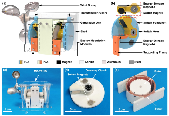 论文所述成果为一种磁开关结构的摩擦纳米发电机(MS-TENG)。这种摩擦纳米发电机由传动齿轮、能量调制模块和发电单元组成。当风间歇性地吹在风杯上时,MS-TENG能通过能量调制模块使风能转化为连续的、有规律的电能。其中,能量调制模块储存和释放的能量不取决于外界输入的风速,而是依赖于磁铁的磁力。实验结果表明,MS-TENG可以作为电源工作,输出特性为410V,18μA,155nC,峰值功率为4.82mW,足以为500个串联的LED或温度计供电。
